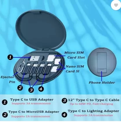 60W USB Adapter Cable Conversion Storage Box, Multi-Type Charging Convertor USB C to Lightning Type C Micro Data Transfer Tool Contains Card Slot Tray Eject Pin, Use as Phone Holder (Multicolor)1pc Spiral Cable Protector (1.5 Mtr) AND 4pcs Cable Protector.