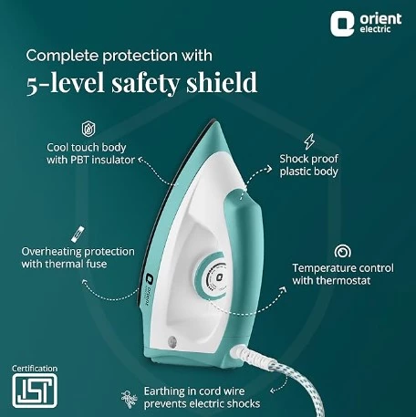 • Complete protection with 5-level safety shield: Orient electric’s dry iron offers completely protection with a 5-level safety shield. It has a PBT insulator that ensures a cool touch body, a thermal fuse for protection against overheating, a shock-proof plastic body, a thermostat that gives maximum protection against overheating and fabric damage, and earthing in cord wire that provides safety against electric shocks.
