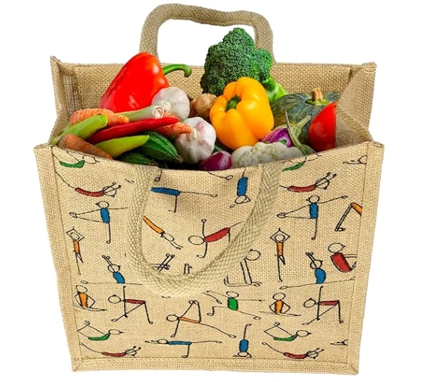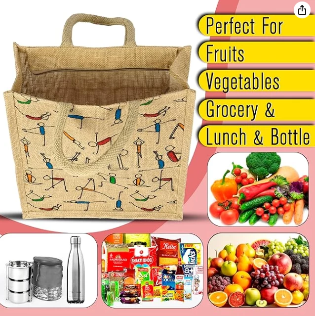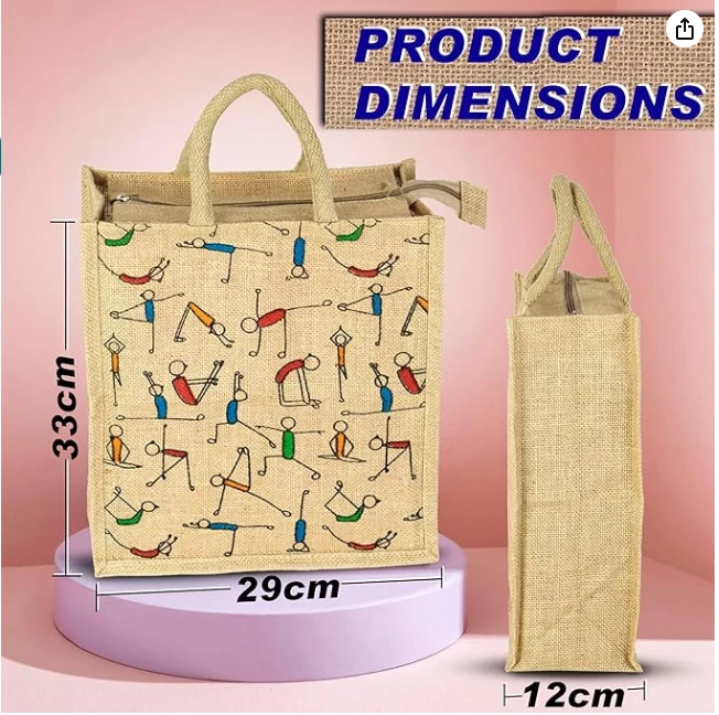 SPECIAL FEATURE : This Jute Bag is Suitable for return gifts, lunch box and water bottle inside., This bag comes with yoga print & with Zipper & can also be used for vegetable & milk carry bag.